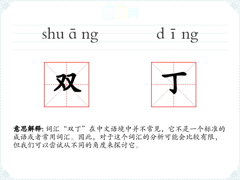 “双丁”字面意思可能是指两个姓丁的人,或者两个名为“丁”的事物。由于缺乏具体的语境,这个词汇的基本含义并不明确。
