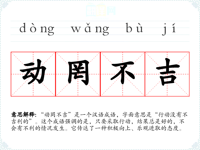 “动罔不吉”是一个汉语成语,字面意思是“行动没有不吉利的”。这个成语强调的是,只要采取行动,结果总是好的,不会有不利的情况发生。它传达了一种积极向上、乐观进取的态度。