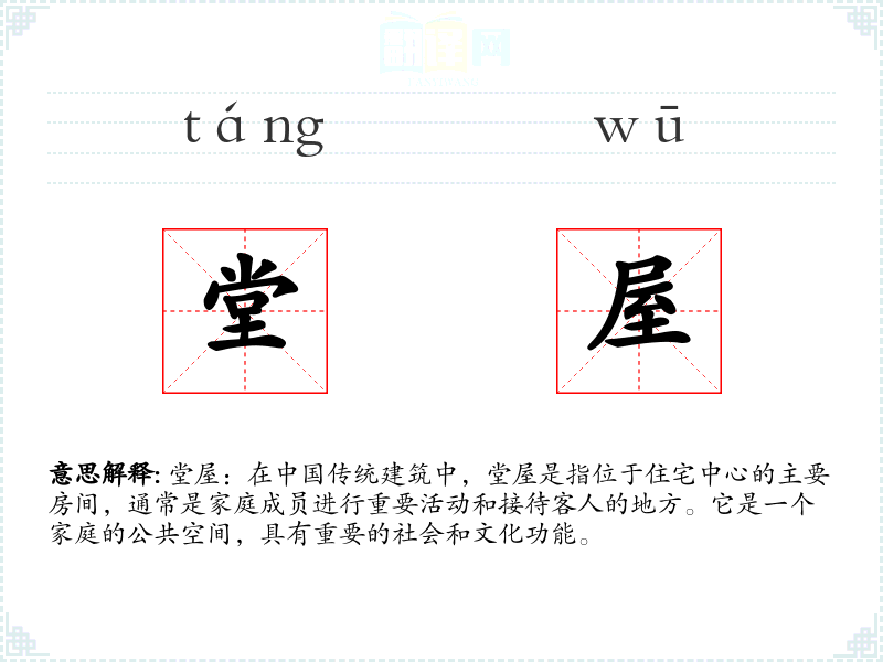 - 口语:在日常口语中,堂屋可能被简称为“堂”,用于指代家中的主要房间。