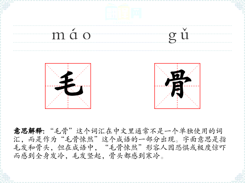 “毛骨”这个词汇在中文里通常不是一个单独使用的词汇,而是作为“毛骨悚然”这个成语的一部分出现。字面意思是指毛发和骨头,但在成语中,“毛骨悚然”形容人因恐惧或极度惊吓而感到全身发冷,毛发竖起,骨头都感到寒冷。