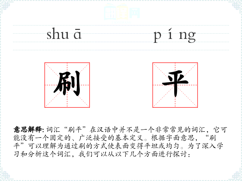 词汇“刷平”在汉语中并不是一个非常常见的词汇,它可能没有一个固定的、广泛接受的基本定义。根据字面意思,“刷平”可以理解为通过刷的方式使表面变得平坦或均匀。为了深入学习和分析这个词汇,我们可以从以下几个方面进行探讨: