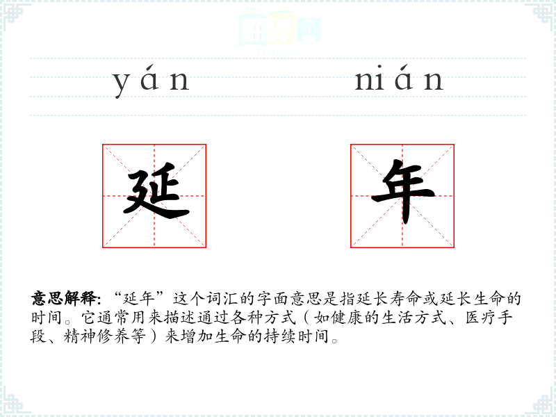 “延年”这个词汇的字面意思是指延长寿命或延长生命的时间。它通常用来描述通过各种方式(如健康的生活方式、医疗手段、精神修养等)来增加生命的持续时间。