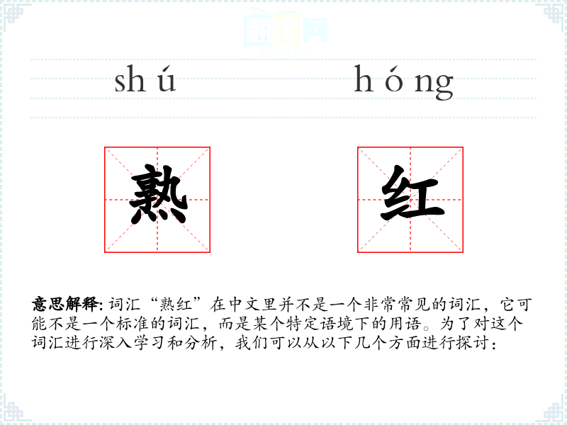 词汇“熟红”在中文里并不是一个非常常见的词汇,它可能不是一个标准的词汇,而是某个特定语境下的用语。为了对这个词汇进行深入学习和分析,我们可以从以下几个方面进行探讨: