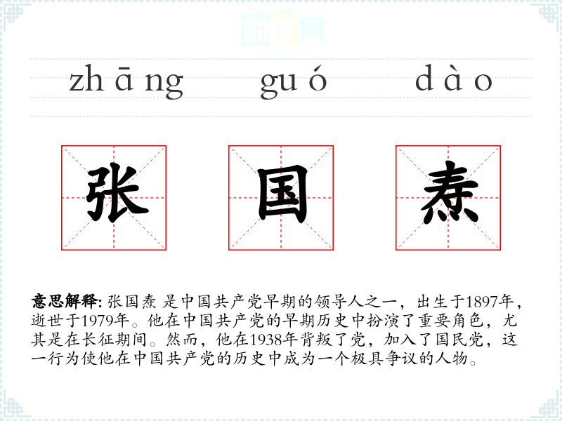 张国焘 作为一个专有名词,其词源直接来源于其个人姓名。在共产党的历史文献中,他的名字通常与特定的历史和评价联系在一起,这些评价随着时间的推移而演变。