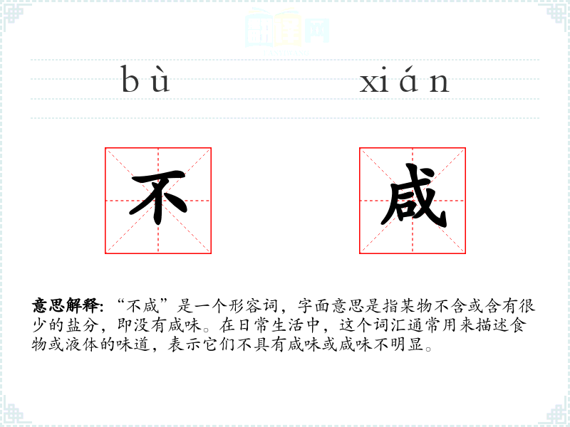 “不咸”由“不”和“咸”两个字组成。“不”是一个否定词,而“咸”源自古代汉语,意指盐的味道。随着语言的发展,“不咸”逐渐被用来描述缺乏咸味的状态。
