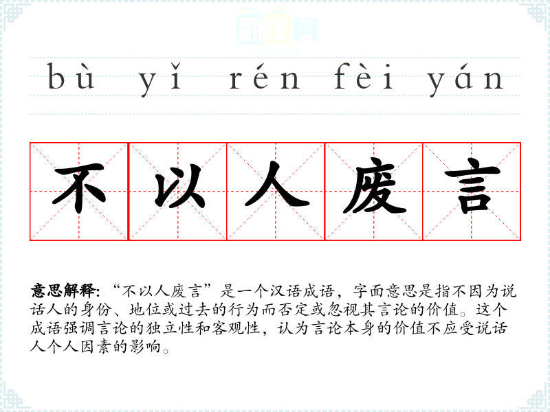 “不以人废言”是一个汉语成语,字面意思是指不因为说话人的身份、地位或过去的行为而否定或忽视其言论的价值。这个成语强调言论的独立性和客观性,认为言论本身的价值不应受说话人个人因素的影响。
