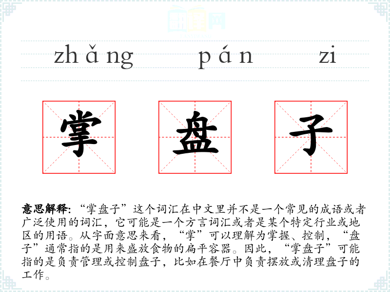 由于“掌盘子”不是一个标准的中文词汇,它的词源和演变可能不太清楚。它可能是从某个方言或者特定行业的术语演变而来。