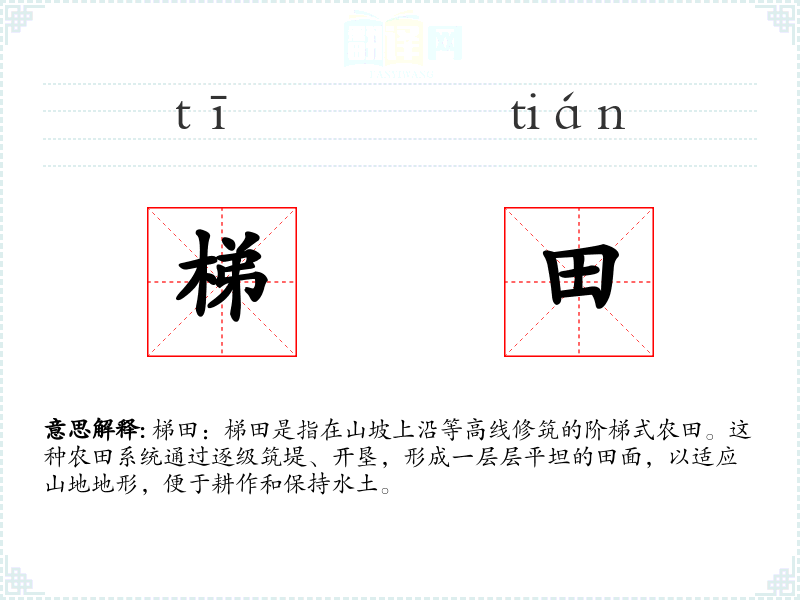 - 反义词:平原、草原(这些词汇与梯田形成鲜明对比,指的是地势平坦的地区)