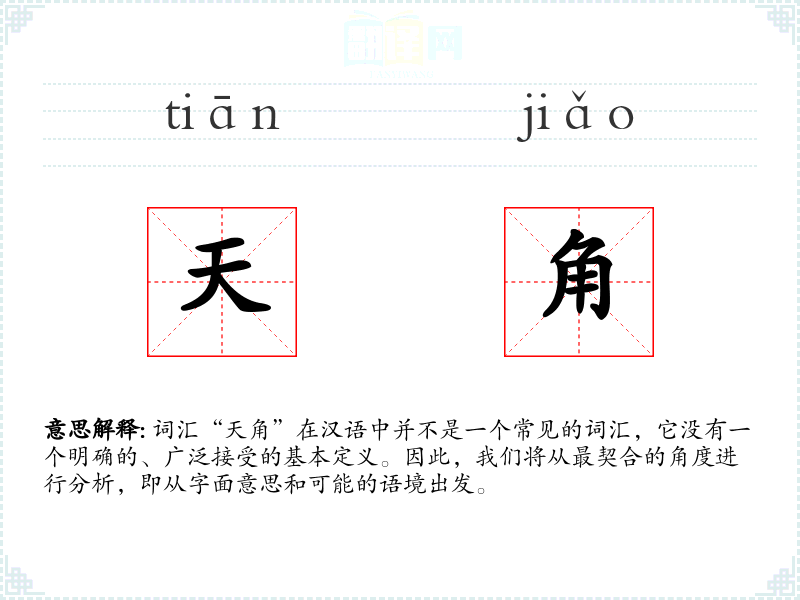 词汇“天角”在汉语中并不是一个常见的词汇,它没有一个明确的、广泛接受的基本定义。因此,我们将从最契合的角度进行分析,即从字面意思和可能的语境出发。