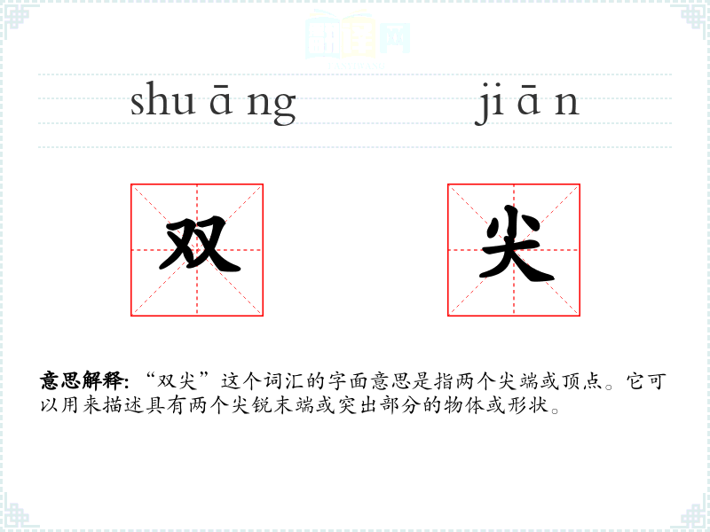 “双尖”这个词汇的字面意思是指两个尖端或顶点。它可以用来描述具有两个尖锐末端或突出部分的物体或形状。