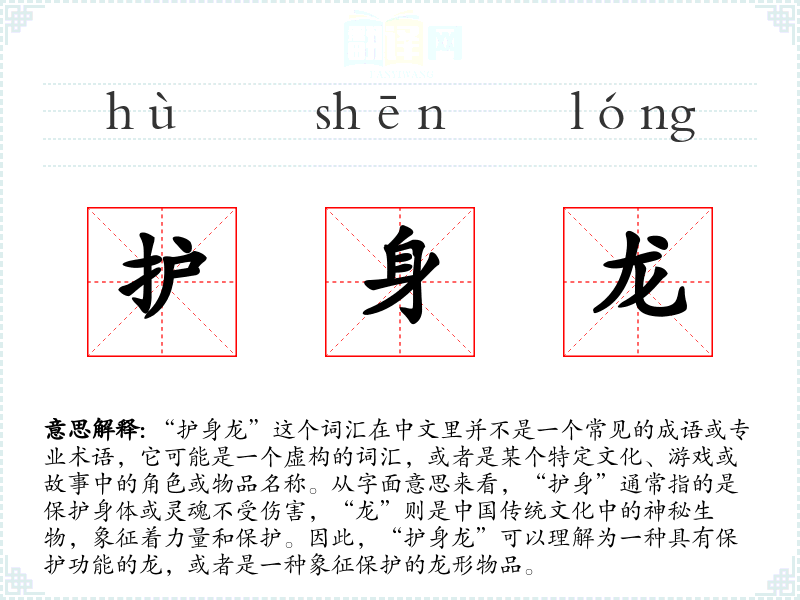 "护身龙"的意思解释、护身龙是什么意思由翻译网汉语词典查词提供。