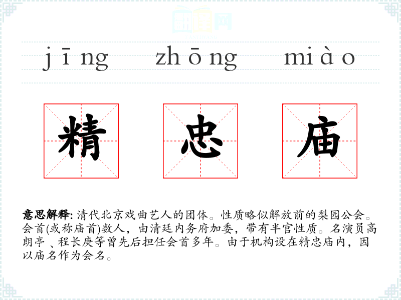 清代北京戏曲艺人的团体。性质略似解放前的梨园公会。会首(或称庙首)数人,由清廷内务府加委,带有半官性质。名演员高朗亭﹑程长庚等曾先后担任会首多年。由于机构设在精忠庙内,因以庙名作为会名。