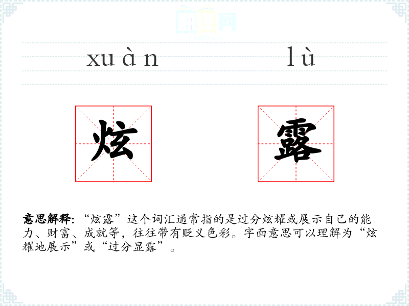 “炫露”这个词汇通常指的是过分炫耀或展示自己的能力、财富、成就等,往往带有贬义色彩。字面意思可以理解为“炫耀地展示”或“过分显露”。