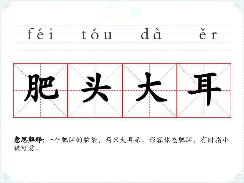 一个肥胖的脑袋,两只大耳朵。形容体态肥胖,有时指小孩可爱。
