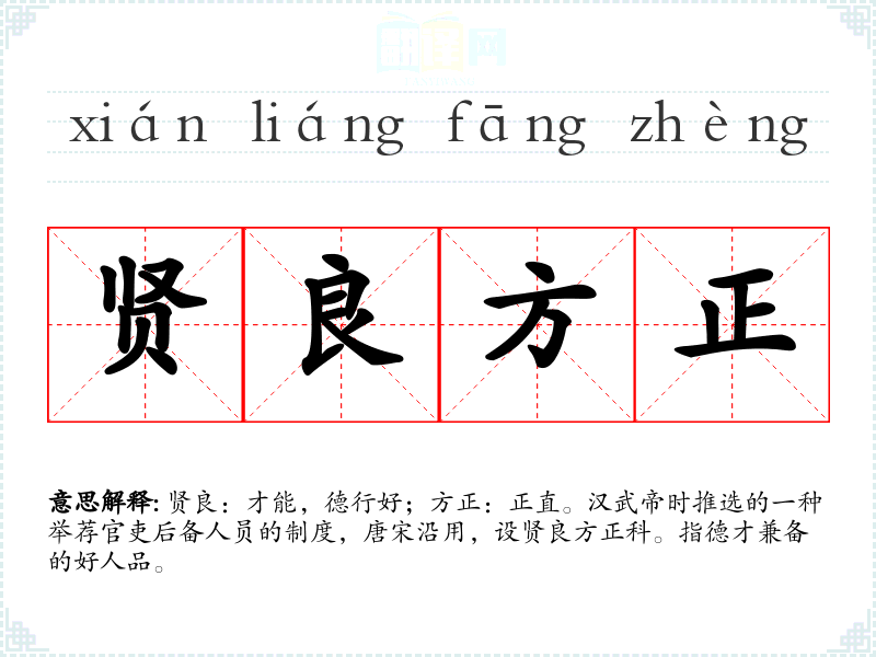 贤良:才能,德行好;方正:正直。汉武帝时推选的一种举荐官吏后备人员的制度,唐宋沿用,设