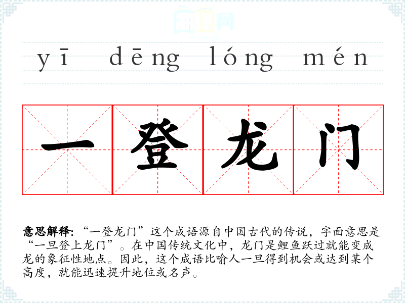 “一登龙门”这个成语源自古代的传说,字面意思是“一旦登上龙门”。在传统文化中,龙门是鲤鱼跃过就能变成龙的象征性地点。因此,这个成语比喻人一旦得到机会或达到某个高度,就能迅速提升地位或名声。