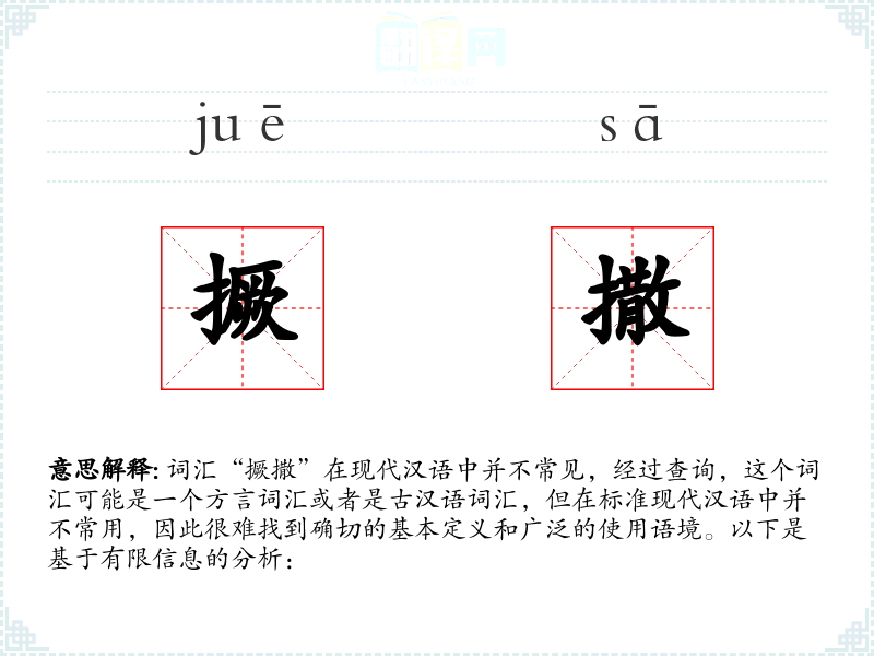 词汇“撅撒”在现代汉语中并不常见,经过查询,这个词汇可能是一个方言词汇或者是古汉语词汇,但在标准现代汉语中并不常用,因此很难找到确切的基本定义和广泛的使用语境。以下是基于有限信息的分析: