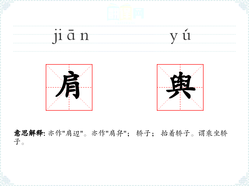 亦作"肩辺"。亦作"肩舁"; 轿子; 抬着轿子。谓乘坐轿子。
