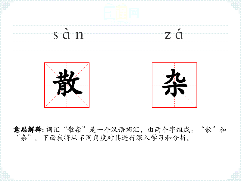 词汇“散杂”是一个汉语词汇,由两个字组成:“散”和“杂”。下面我将从不同角度对其进行深入学*和分析。