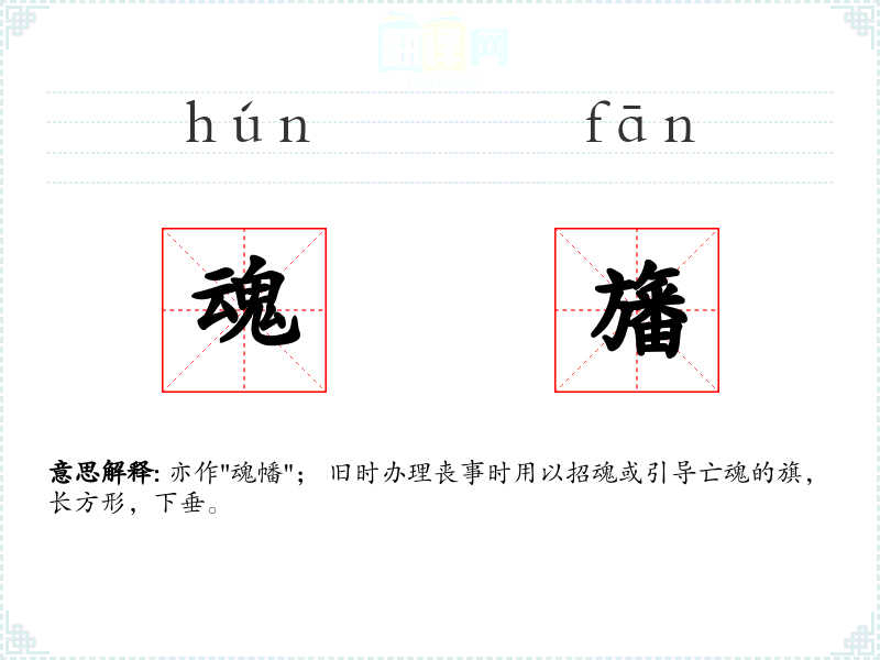 亦作"魂幡"; 旧时办理丧事时用以招魂或引导亡魂的旗,长方形,下垂。