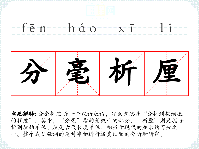 分毫析厘 是一个汉语成语,字面意思是“分析到极细微的程度”。其中,“分毫”指的是极小的部分,“析厘”则是指分析到厘的单位,厘是古代长度单位,相当于现代的厘米的百分之一。整个成语强调的是对事物进行极其细致的分析和研究。