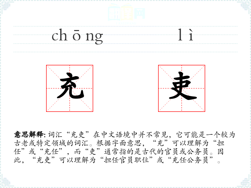 - 理解:“充吏”是一个具有历史和文化特色的词汇,虽然在现代汉语中不常用,但在研究古代官制和历史时具有重要意义。