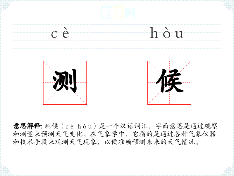 - 反义词:无(由于“测候”是一个特定领域的术语,通常没有直接的反义词)