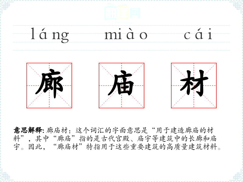 廊庙材:这个词汇的字面意思是“用于建造廊庙的材料”,其中“廊庙”指的是古代宫殿、庙宇等建筑中的长廊和庙宇。因此,“廊庙材”特指用于这些重要建筑的高质量建筑材料。