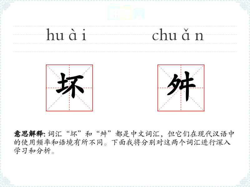 词汇“坏”和“舛”都是中文词汇,但它们在现代汉语中的使用频率和语境有所不同。下面我将分别对这两个词汇进行深入学*和分析。