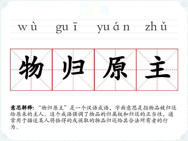 “物归原主”是一个汉语成语,字面意思是指物品被归还给原来的主人。这个成语强调了物品的归属权和归还的正当性,通常用于描述某人将拾得的或误取的物品归还给其合法所有者的行为。
