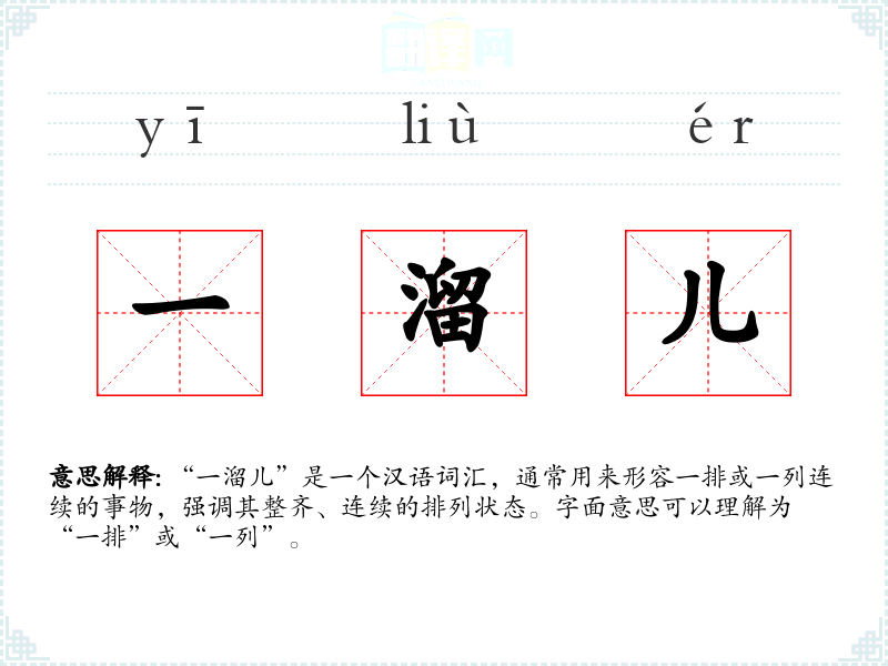 “一溜儿”是一个汉语词汇,通常用来形容一排或一列连续的事物,强调其整齐、连续的排列状态。字面意思可以理解为“一排”或“一列”。