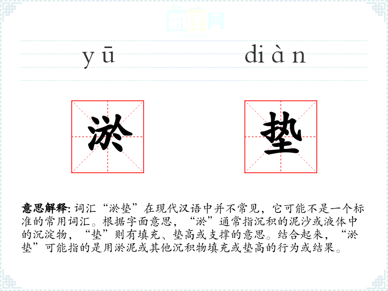 词汇“淤垫”在现代汉语中并不常见,它可能不是一个标准的常用词汇。根据字面意思,“淤”通常指沉积的泥沙或液体中的沉淀物,“垫”则有填充、垫高或支撑的意思。结合起来,“淤垫”可能指的是用淤泥或其他沉积物填充或垫高的行为或结果。
