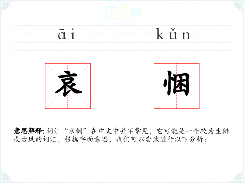 词汇“哀悃”在中文中并不常见,它可能是一个较为生僻或古风的词汇。根据字面意思,我们可以尝试进行以下分析: