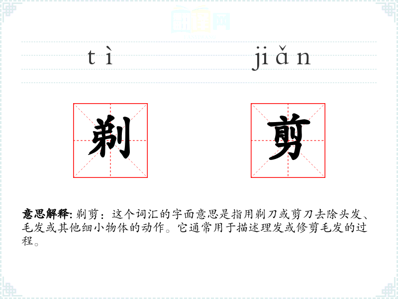 剃剪:这个词汇的字面意思是指用剃刀或剪刀去除头发、毛发或其他细小物体的动作。它通常用于描述理发或修剪毛发的过程。