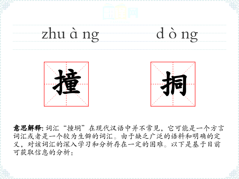 词汇“撞垌”在现代汉语中并不常见,它可能是一个方言词汇或者是一个较为生僻的词汇。由于缺乏广泛的语料和明确的定义,对该词汇的深入学习和分析存在一定的困难。以下是基于目前可获取信息的分析: