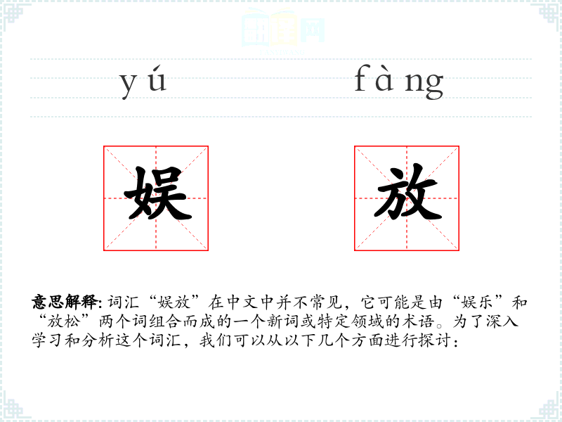 词汇“娱放”在中文中并不常见,它可能是由“娱乐”和“放松”两个词组合而成的一个新词或特定领域的术语。为了深入学*和分析这个词汇,我们可以从以下几个方面进行探讨: