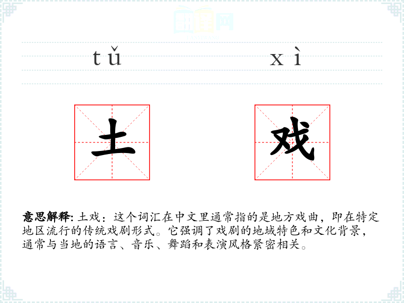 土戏:这个词汇在中文里通常指的是地方戏曲,即在特定地区流行的传统戏剧形式。它强调了戏剧的地域特色和文化背景,通常与当地的语言、音乐、舞蹈和表演风格紧密相关。