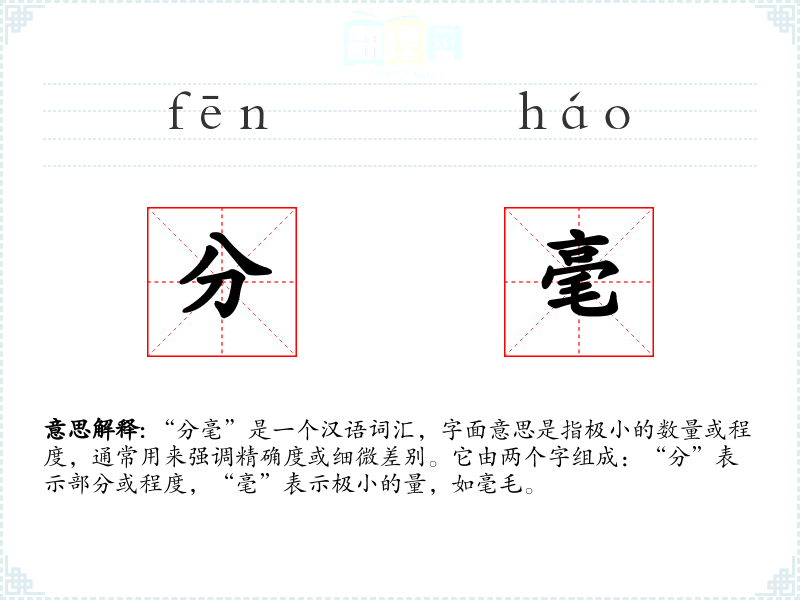 “分毫”是一个汉语词汇,字面意思是指极小的数量或程度,通常用来强调精确度或细微差别。它由两个字组成:“分”表示部分或程度,“毫”表示极小的量,如毫毛。