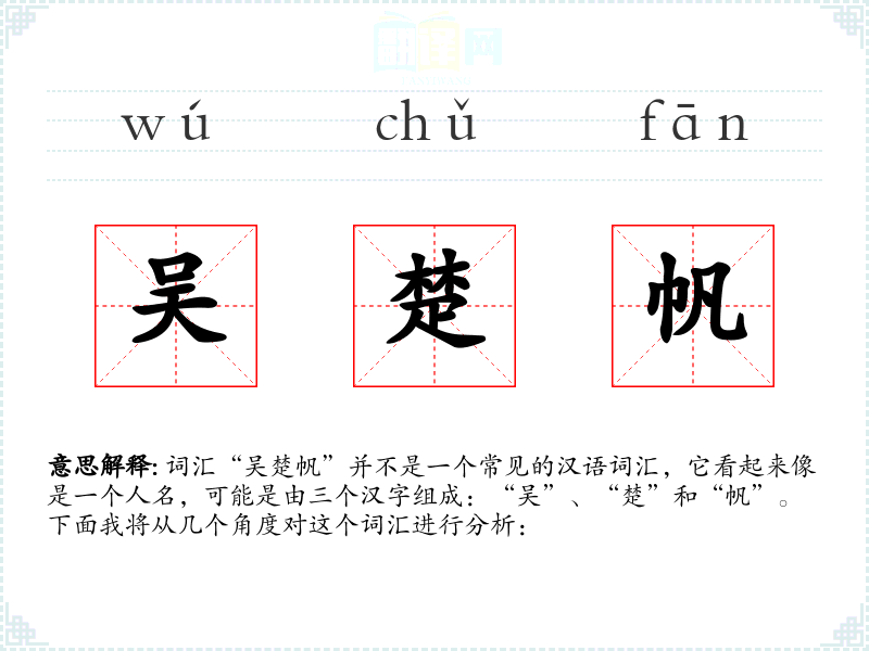 词汇“吴楚帆”并不是一个常见的汉语词汇,它看起来像是一个人名,可能是由三个汉字组成:“吴”、“楚”和“帆”。下面我将从几个角度对这个词汇进行分析: