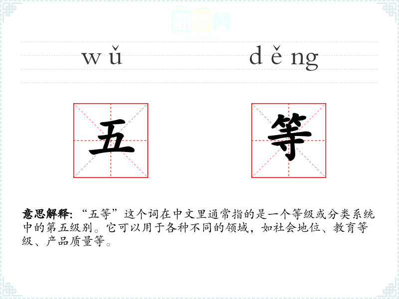 “五等”这个词在中文里通常指的是一个等级或分类系统中的第五级别。它可以用于各种不同的领域,如社会地位、教育等级、产品质量等。
