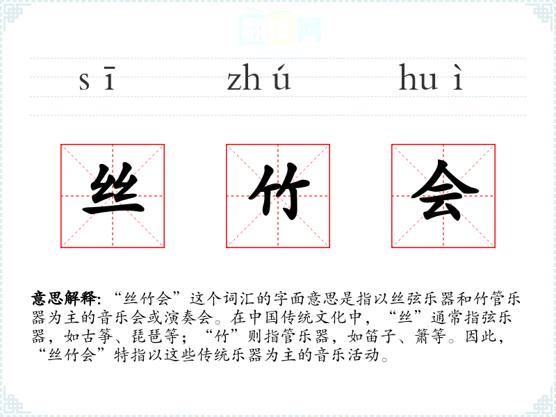 - 专业领域:在音乐学或**传统音乐研究中,“丝竹会”是一个专业术语,用来指代特定类型的音乐表演。