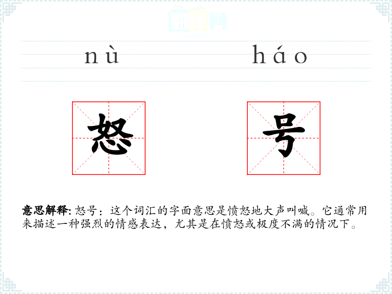 怒号:这个词汇的字面意思是愤怒地大声叫喊。它通常用来描述一种强烈的情感表达,尤其是在愤怒或极度不满的情况下。
