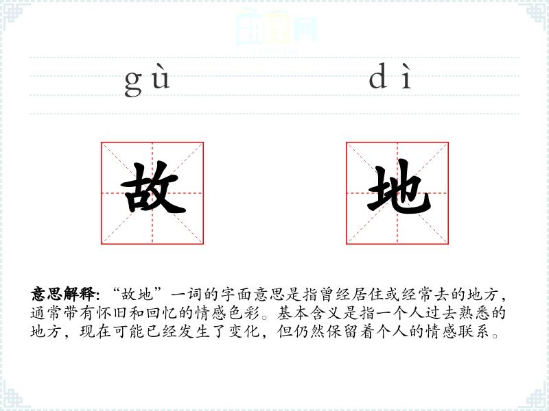 “故地”是一个充满情感色彩的词汇,它不仅指代一个物理空间,更是一个情感的载体,承载着个人的记忆和情感。在语言学*和表达中,理解和运用“故地”这个词,可以帮助我们更好地表达和理解复杂的情感和记忆。