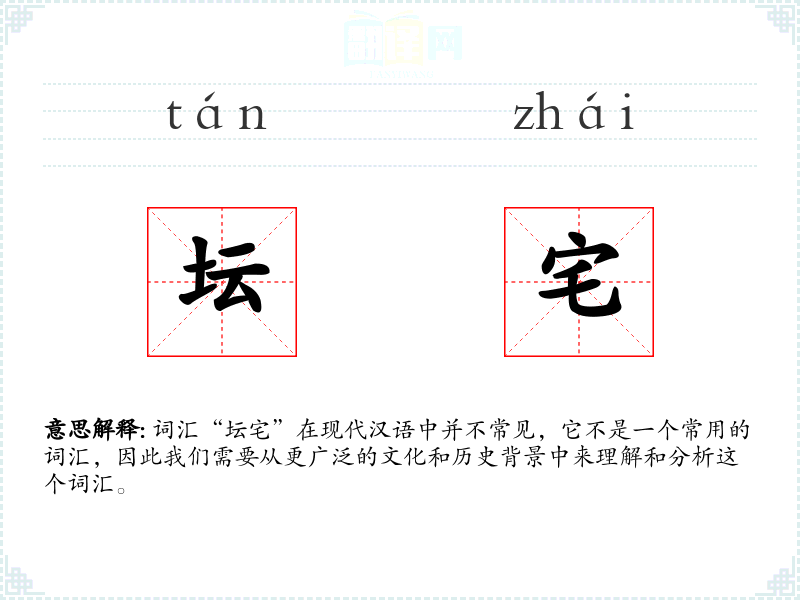 词汇“坛宅”在现代汉语中并不常见,它不是一个常用的词汇,因此我们需要从更广泛的文化和历史背景中来理解和分析这个词汇。