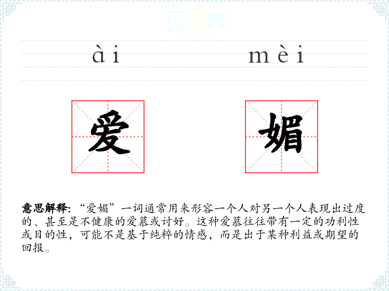“爱媚”一词通常用来形容一个人对另一个人表现出过度的、甚至是不健康的爱慕或讨好。这种爱慕往往带有一定的功利性或目的性,可能不是基于纯粹的情感,而是出于某种利益或期望的回报。