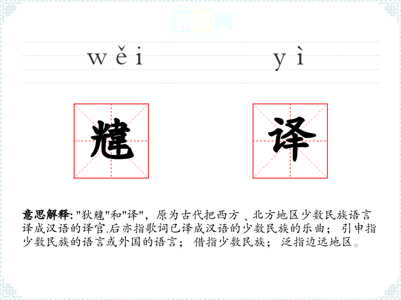 "狄韑"和"译",原为古代把西方﹑北方地区少数民族语言译成汉语的译官.后亦指歌词已译成汉语的少数民族的乐曲; 引申指少数民族的语言或外国的语言; 借指少数民族; 泛指边远地区。