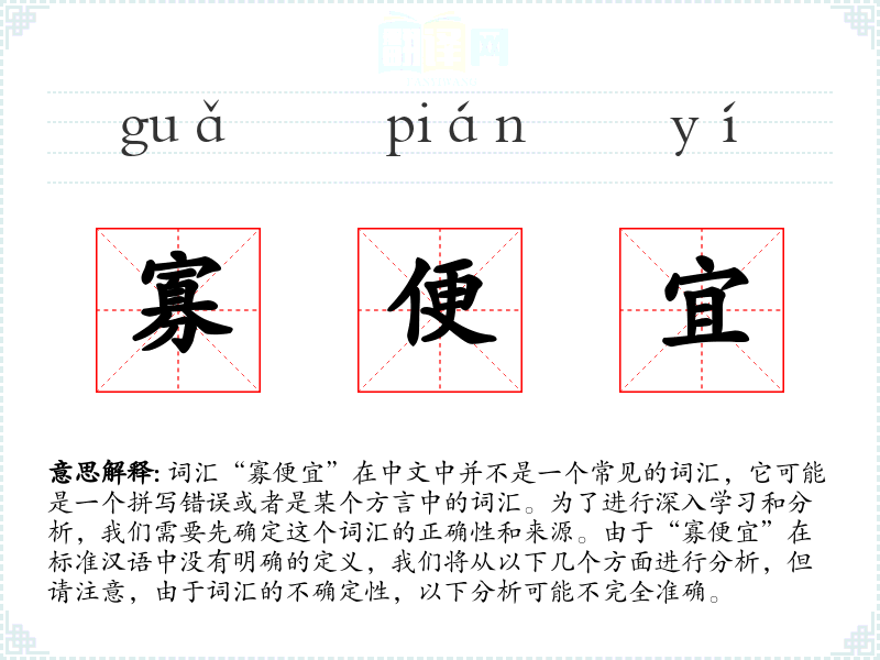 由于“寡便宜”不是一个标准汉语词汇,我们无法给出确切的字面意思和基本含义。如果这是一个方言词汇,它可能意味着“很少便宜”或“不常便宜”。