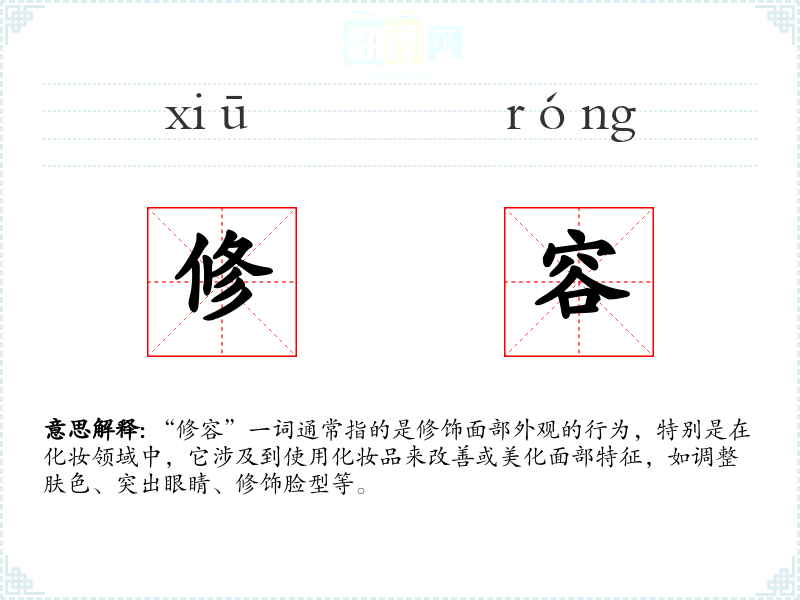 “修容”一词源于汉语,由“修”(修饰、改善)和“容”(容貌、外观)组成。随着美容行业的发展,这个词在现代汉语中得到了广泛应用。