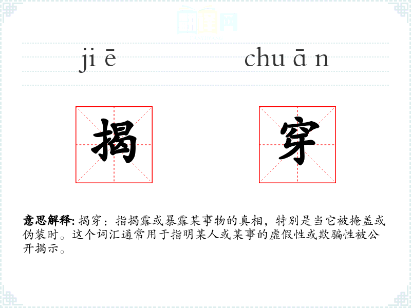 揭穿:指揭露或暴露某事物的真相,特别是当它被掩盖或伪装时。这个词汇通常用于指明某人或某事的虚假性或欺骗性被公开揭示。