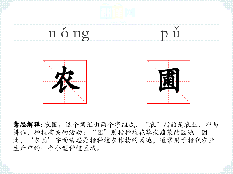 农圃:这个词汇由两个字组成,“农”指的是农业,即与耕作、种植有关的活动;“圃”则指种植花草或蔬菜的园地。因此,“农圃”字面意思是指种植农作物的园地,通常用于指代农业生产中的一个小型种植区域。